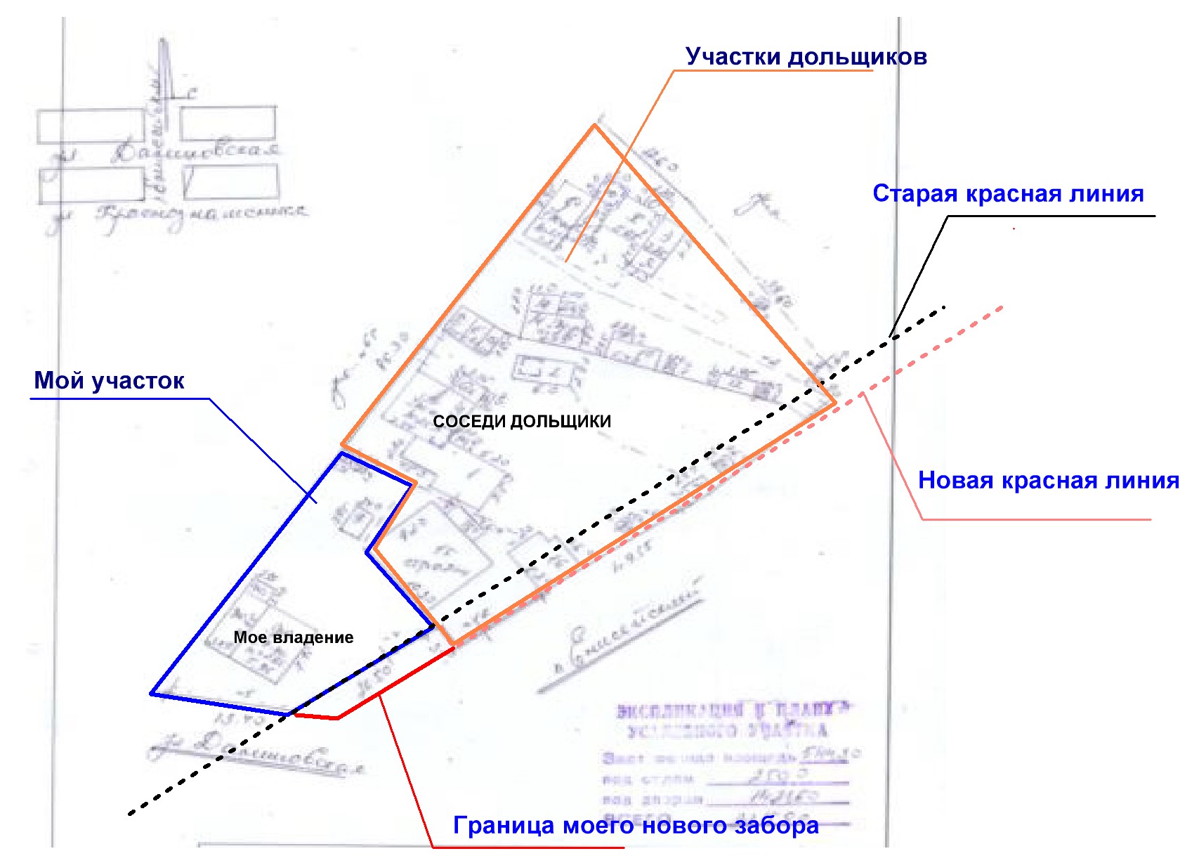 Все доли выделены заборами по границам домовладений и имеют отдельные ворота и калитки на каждый участок, мой участок угловой имел "загиб" во внутрь по линии заборов. Я решил сделать новый забор по общей линии заборов по прямой, теперь мне говорят, что я залез на красную линию, якобы несколько лет назад они вынесли красную линию, спрашиваю как могли вынести часть участка, почему мой не вынесен, в ответ мычание и ворчание. Отношения признаюсь не приязненные, к сожалению, они все родственники и "положили глаз", на мой участок, дом с участком долго стоял без жильцов, пришел в ветхость, они хотели зацапать по праву дольщиков, но я перекупил у старого хозяина. Может сумбурно написал, в общем, если я залез на красную линию, что теперь мне делать, можно ли узаконить это кусманчик, какой штраф-санкции, что может мне быть за это надеюсь, в "терновый куст не бросят":)