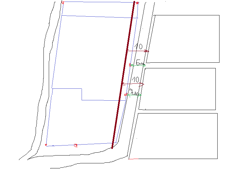 синим цветом обозначены наши участки, красные точки-столбики от предыдущих замеров, зеленым-ширина дороги до столбиков (6-7м), бордовым-новая граница с учетом ширины дороги в 10м. Соседские участки отмежованы