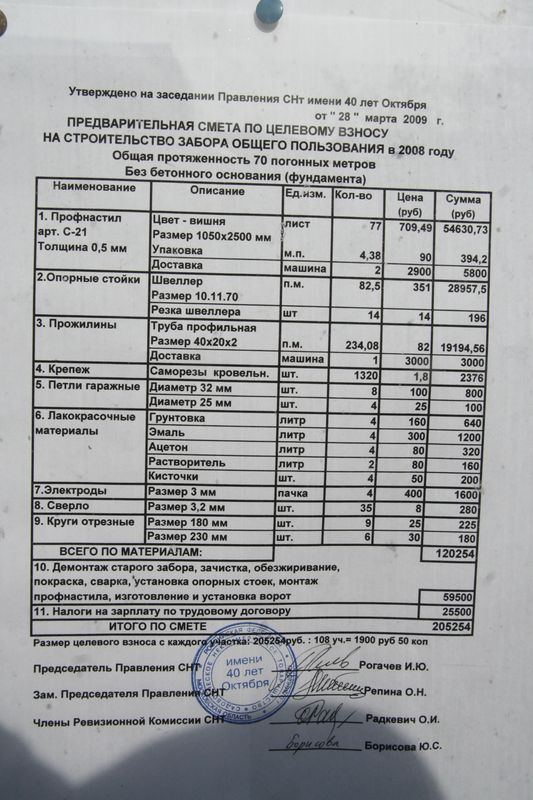 В нашем СНТ вот уже третий год подряд правление усердно и в поте лица создает целевое имущество-строит на целевые взносы забор , ограждающий СНТ от дороги. Все по правилам ФЗ-66. Собирается собрание, на собрании утверждается сумма по целевым взносам, потом если садоводы начнут докучать "покажите смету" - "примерная" смета вывешивается на доске объявлений.( smeta2) Но лучше не вывешивать и статьи не расписывать, ибо пытливый садовод проводит маркетинг и обнаруживает, что материалы на 30% дороже , чем на рынке, и с 390 тыр на 90 м забора уже только 30 тыр садоводов можно "отбить" просто на материалах. Выступает на собрании как же так братцы, давайте поторгуемся, тендер проведем среди строителей, среди продавцов. А председатель собрания (он же председатель СНТ) ему в ответ: у нас все по закону, все по договору- черной кассы нет- здесь мы ничего не нарушаем, а свои вопросы задавайте ревизионной комиссии, вы ее на собрании выбирали, вот пусть она вам и отчитывается. А мы не обязаны на каждое заявление садовода копии бумажек делать. Пишет садовод "открытое письмо" комиссии , и на собрании его вручает а ему так вежливо отвечает председатель рев комиссии, что цены на материалы он не обязан сравнивать, нет такого в законе, а все остальное правление делает по закону. Тут встает еще один садовод и говорит, а что тут отдельный товарищ уводит собрание в сторону и вопросы глупые задает, время затягивает, предлагаю лишить этого товарищей слова на собрании. Т.е запретить ему на собрании выступать. А так как на собрании из 106 членов всего присутствуют 50% голосов, а из них 50% по доверенностям, а 90% всех доверенностей у 2% садоводов ( догадайся у кого) , то слова "правдолюбца" лишают с явным перевесом голосов. Но все по закону. А дальше готовится "протокол " этого собрания, в котором "любознательному" садоводу отвечают, что все бумажки собранию Правление показало, вопросов у собрания нет, все по закону. А чтобы больше таких "проколов" не допускать, в сметах в дальнейшем ничего не расшифровывается , только итоговые цифры. Нечего "любознательным" по статьям расходов пальцем водить....Так и записали в протоколе: «Был роздан расчет сметы расходов по членским взносам старшим по улицам, где в пустографах предлагалось вписать суммы, утвержденные собранием»