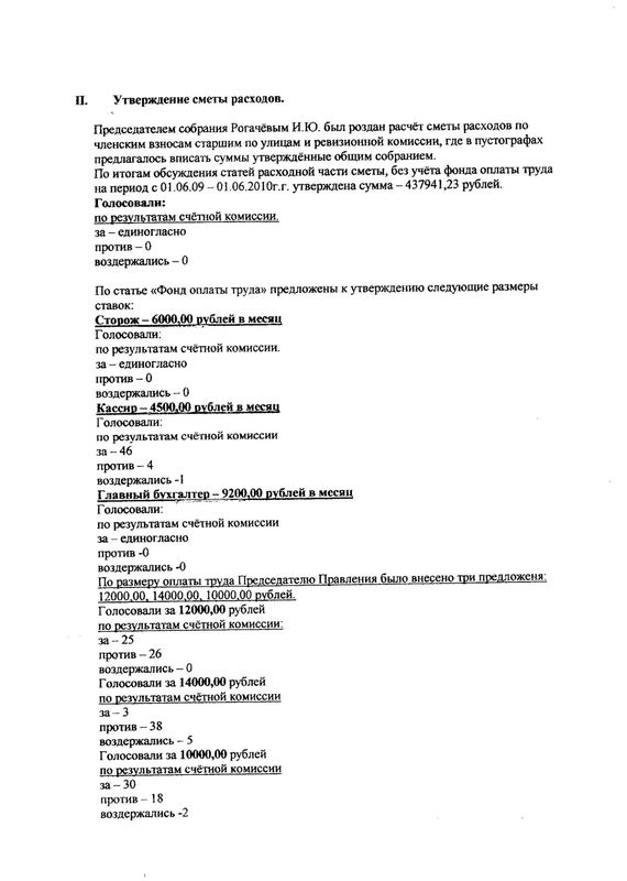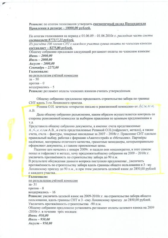 ( protokol 3l) Конечно никакие расчеты розданы не были. И суммы "утвердились только две -итог сметы с ФОТ и итог без ФОТ. А после : "поступило предложение увеличить цену забора до 2865 руб с каждого участка,...." Проголосовали почти все "за"...вместе с доверенностями.....- но все по закону..(protokol 4l). Осталось дело за малым - собрать взносы....