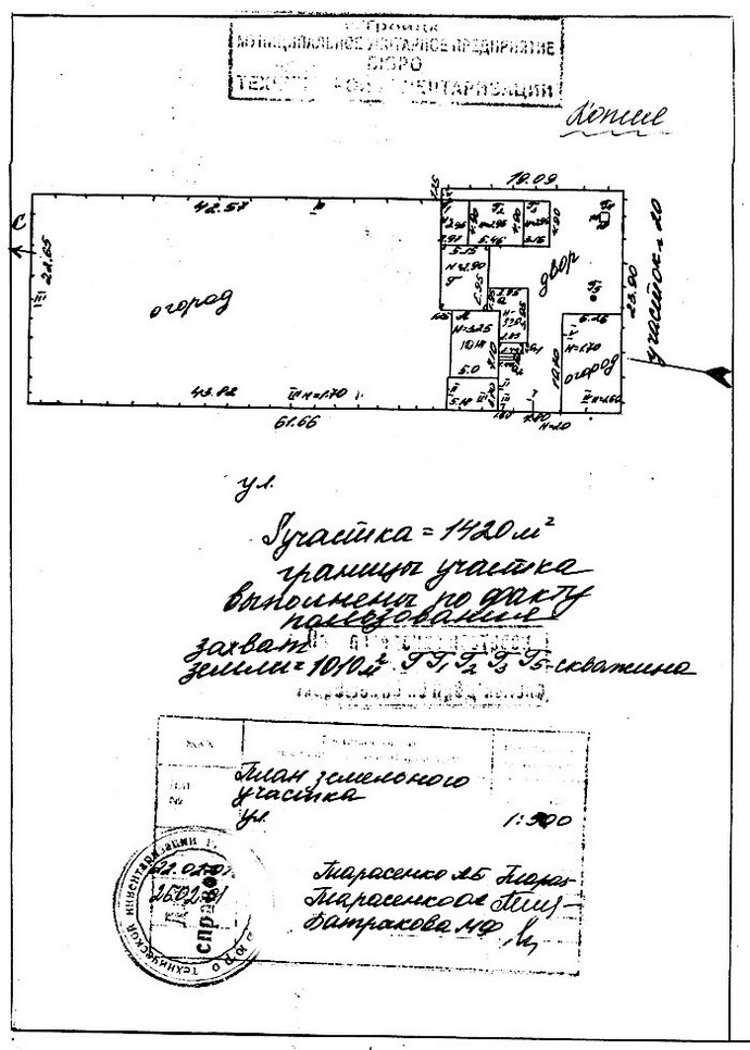 1. Да у продавцов в свидетельстве о праве собственности было тоже 3 сотки. Но в план на момент купли-продажи уже была внесена земля 1010 кв.метров (захват). Как Вы видите в плане, написано что границы выполнены по факту пользования. Дело в том что с тремя сотками мы бы этот дом не купили а продавец оч. торопился уезжать. В земельном комитете и в БТИ нас убедили что если земля в плане то никто нам в ее оформлении после покупки дома препятствовать не имеет права.