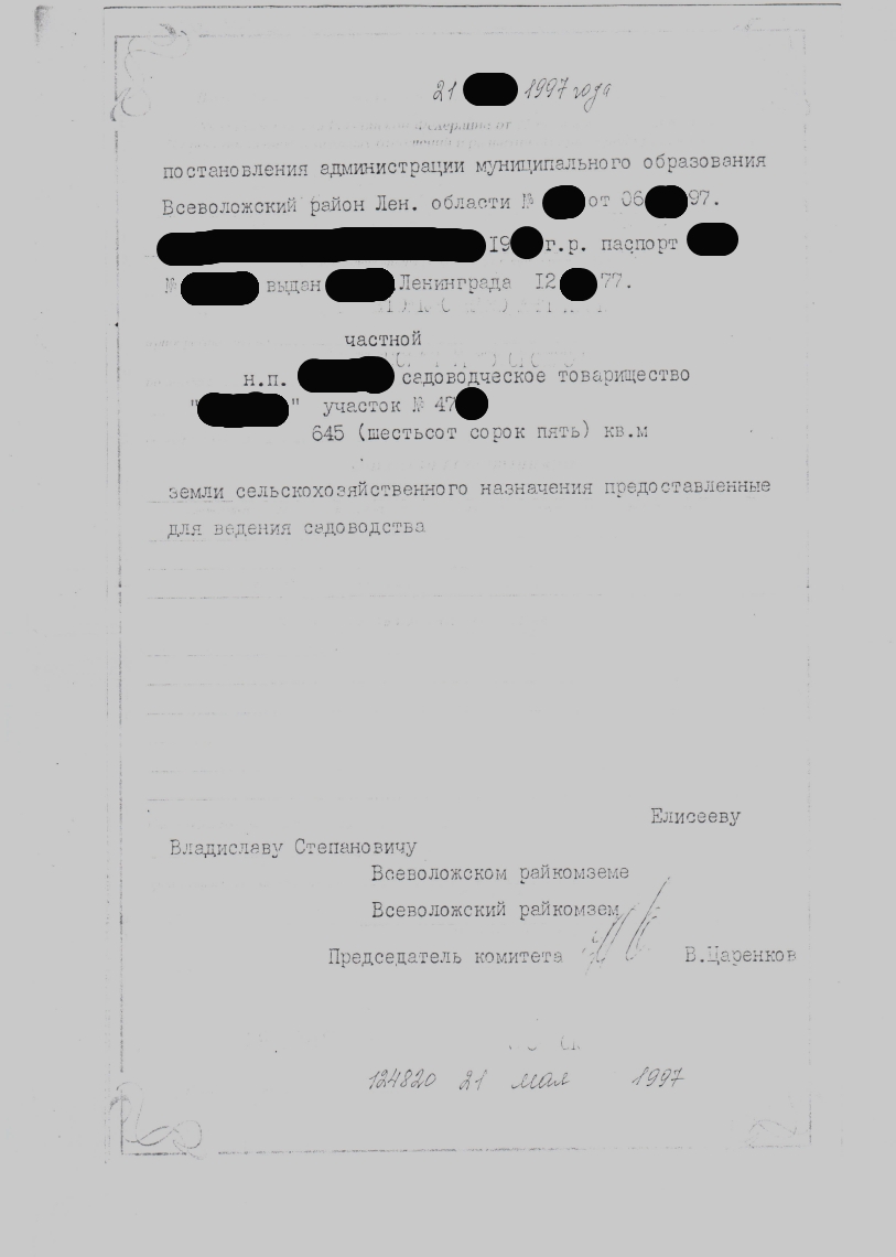 Re: Собственность на землю от 1997 г., на дом собственности нет.